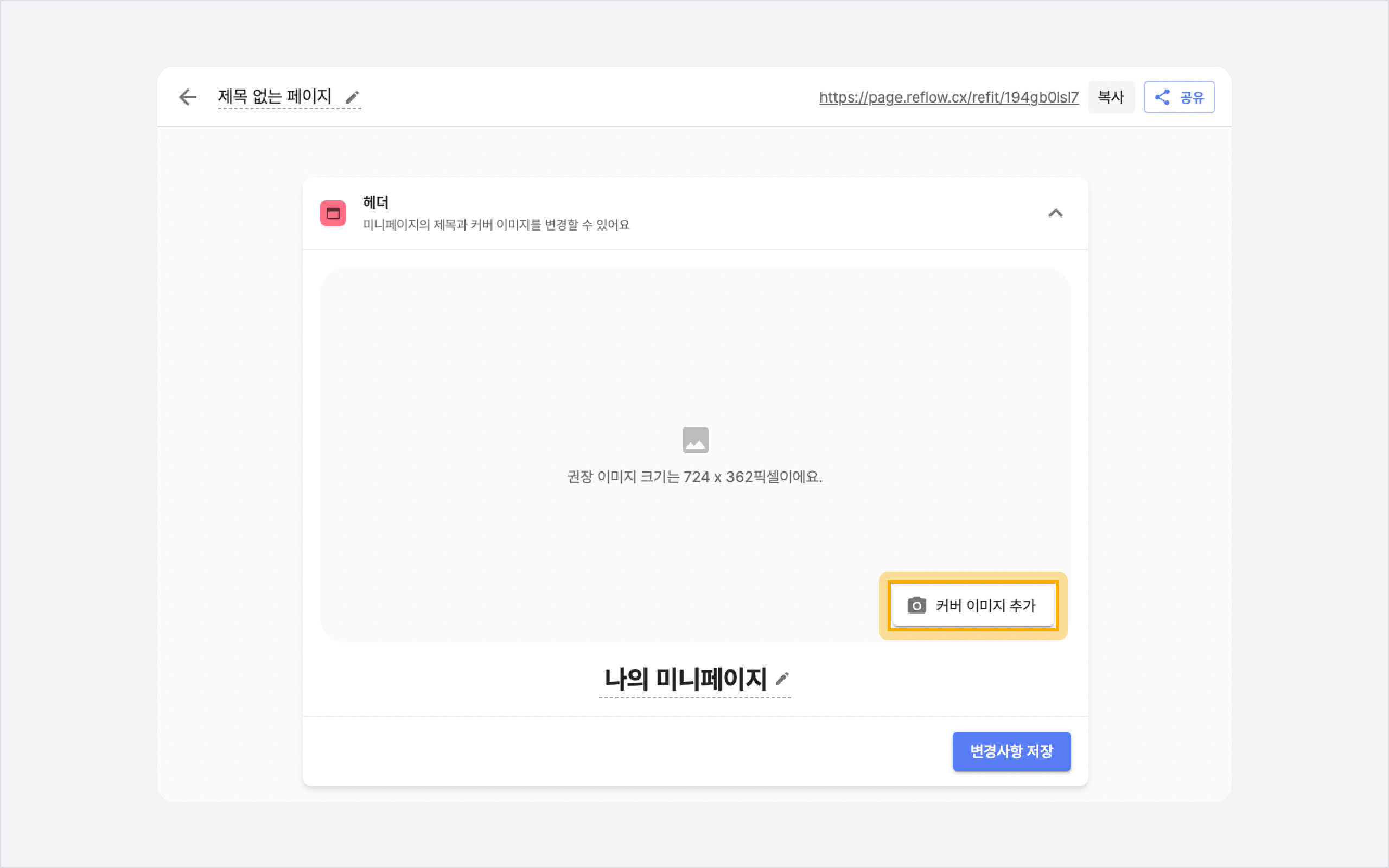 1. 커버 이미지 영역의 [커버 이미지 추가] 버튼을 클릭합니다. 기존 커버 이미지가 있을 경우, 이 버튼의 이름은 [커버 이미지 변경]으로 표시됩니다.